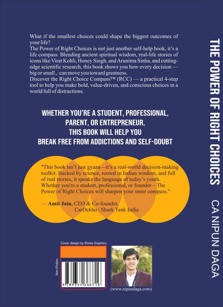 Whether you are a student, professional, parent, or entrepreneur, this book will give you hacks to unlock success and make smarter choices. Every day you make hundreds of decisions—some small, some life-changing. But what if one right choice could rewrite your future? In a world full of distractions, confusion, and endless options, The Power of Right Choices is your ultimate guide to mastering the art of decision-making. Blending true stories of achievers, spiritual wisdom, and science-backed research, Nipun Daga shows you how the choices you make can transform your career, relationships, health, and happiness. This isn’t just another self-help book—it’s a practical decision-making playbook for real life. Inside this book, you will discover: ✅ The secret decision-making strategies of billionaires, leaders, and world-changers. ✅ How Kapil Sharma turned struggles into stardom—and what you can learn from his choices. ✅ The Apollo 11 story and how embracing change can launch you toward your biggest goals. ✅ Timeless lessons of Ahimsa (nonviolence) and Anekantwad (seeing beyond one perspective) to resolve conflicts and build stronger relationships. ✅ The hidden power of minimalism—why less can actually give you more. ✅ The science of setting big goals and how they create lasting motivation. ✅ Health hacks and mindset shifts that fuel your energy, focus, and performance. ✅ The Right Choice Compass (RCC)—a practical framework to help you make clear, confident decisions in any situation. Why this book is different: It combines spiritual wisdom with modern science, making ancient principles practical for today’s world. It shares true stories of celebrities, leaders, and achievers, proving that these ideas are not just theory but truly livable. Each chapter ends with action challenges to help you apply the lessons immediately. It is written in a youth-friendly, motivational tone, simple enough for teens yet powerful enough for professionals and entrepreneurs. Who should read this book? Students who want clarity in studies, exams, and career choices. Young professionals struggling with stress, confusion, or direction. Parents seeking better decision-making for family and relationships. Entrepreneurs aiming for growth, focus, and long-term success. Anyone who wants to live with purpose, confidence, and inner peace.
